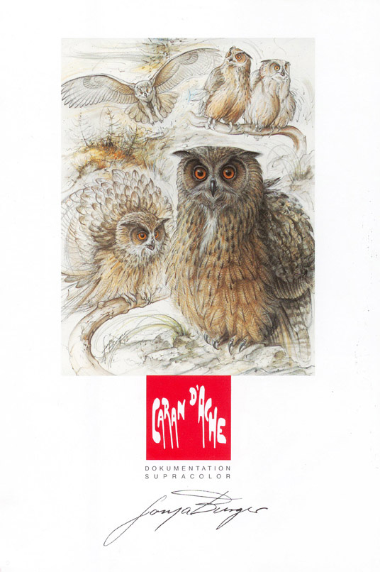 Ein paar Highlights aus meinem Schaffen: 8 Sonderbriefmarken, «Nachtaktive Tiere», mit Phosphordruck, das Licht konnte man in der Dunkelheit sehen und noch weitere vier «Tiere des Waldes». Sehr viel Weinetiketten durfte ich für Coop /Transgourmet zeichnen und gestalten. Für Franklin-Method gehöre ich seit vielen Jahren zum Team und mache alle Illustrationen für Bücher und zum Unterrichten. Für Caran d’ Ache war ich auch tätig, konnte auf einigen Messen auch im Ausland die neuen Zeichen- und Maltechniken vorstellen. Das schönste Projekt war der «Uhu» wo ich den Aufbau der Supracolor-Farbstifte darstellten konnte. Des Weiteren habe ich ca. 50 Poster für Rüdiger-Anatomie, Berlin gezeichnet. Auch für die ehemalige Swissair konnte ich eine Reihe von Gewürzpflanzen für die Menükarte (1. Klasse) darstellen und noch die allgemeine Unterhaltung an Bord mit weltweit verschiedenen Vögeln, die ja fliegen und musizieren. Einige Jahre konnte ich für «Migros» layouten. d. h. die Situationen für den Weihnachtskalender aus meiner Vorstellung zeichnen. Nachher wurden die Situationen von Fotografen aufgestellt und in Natura fotografiert. Layouten dient u. a. dem Verkauf von Projekten. Eine Zeichnung ist noch offen und lässt Änderungen zu.