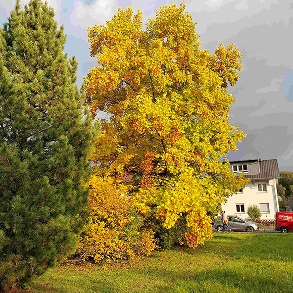 Oft wird die Frage gestellt, wie die Herbstfärbung zustande kommt. Nun ich machte mich schlau und erkundigte mich bei Experten. Hier meine Recherchen in Kürze: Der Baum bereitet sich durch die Laubfärbung auf die kalte und wasserarme Jahreszeit vor. Das Geschehen wird durch Pflanzenhormone gesteuert. Wenn die Tage kürzer und die Nächte kühler werden, setzt ein genetisch gesteuerter Alterungsprozess ein. Der grüne Blattfarbstoff (Chlorophyll), der für die Photosynthese wichtig ist, wird in kleinere Bestandteile abgebaut und bis zum Frühjahr in Zweigen, im Stamm und in der Wurzel gespeichert. Nun kommen die anderen Blattfarbstoffe (Pigmente) zum Vorschein. Es sind die Karotinoide (gelb, orange, rot), Xanthophylle (gelb) und Anthocyane (rot, violett, blau), die für die schöne Herbstfärbung verantwortlich sind. Die braune Verfärbung entsteht, wenn das Blatt abstirbt.